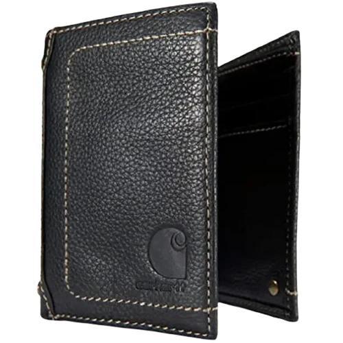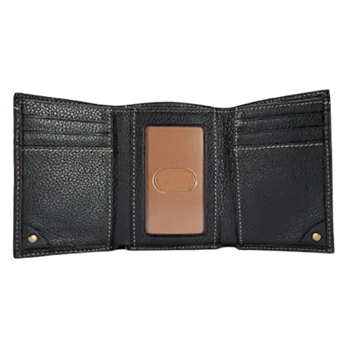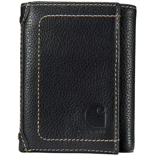 Keep essential cards and cash secure and organized. This men’s trifold wallet is made of full-grain leather and features contrast stitching.