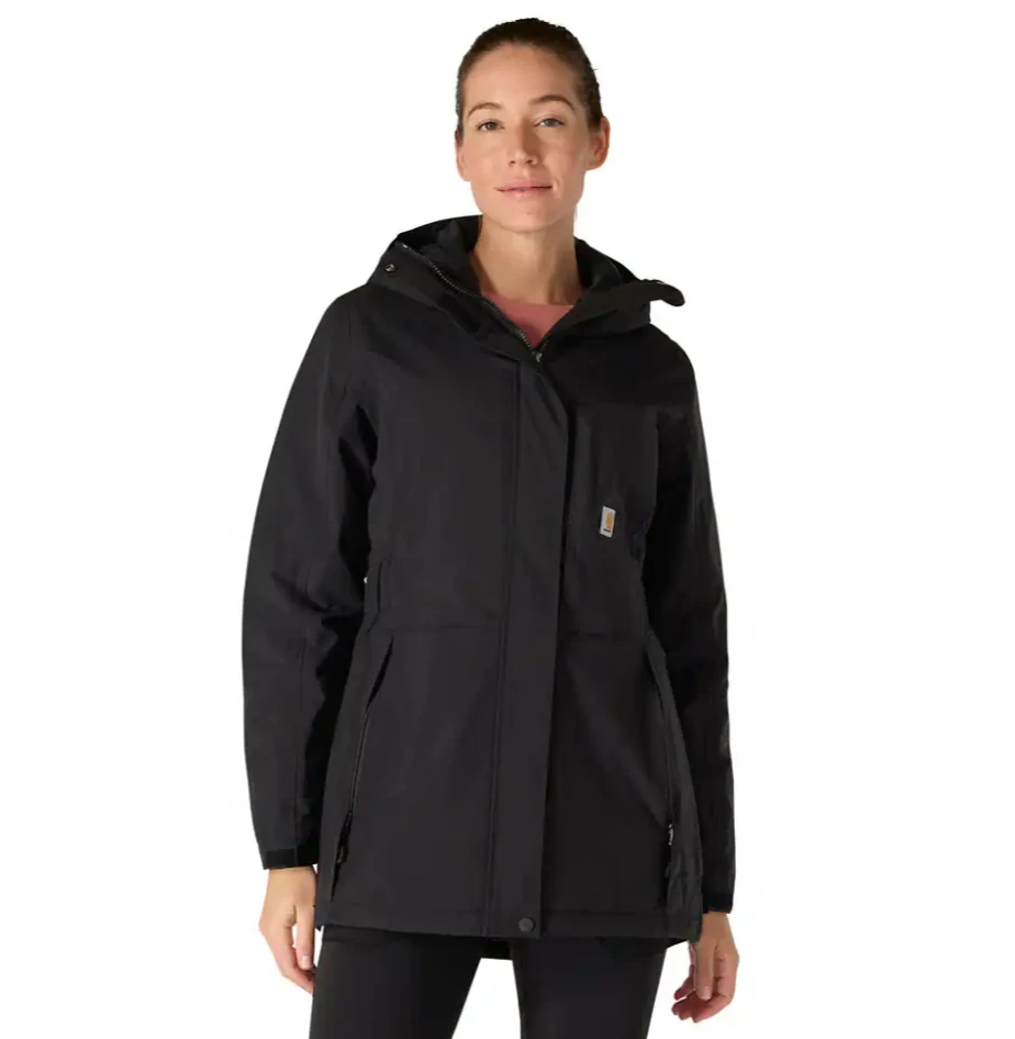 Carhartt durability meets all-weather coverage and insulation in this women’s waterproof insulated jacket. A combination of a Storm Defender® waterproof, breathable protection and an insulated, wind-resistant build seals out cold, wet weather. Synthetic insulation throughout seals in heat without bulk. A relaxed fit includes a little extra room to move.