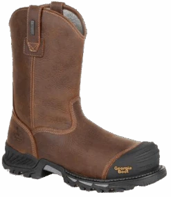 Fight through all the bumps in the road with the Georgia Boot Rumbler composite toe waterproof pull-on work boot. The upper on this 10″ pull-on boot is constructed from full- grain leather and features leather pull loops and an external TPU toe cap for added abrasion resistance and durability. The inside of this composite toe work boot in lined in with high performance mesh and is equipped with our guaranteed Georgia Waterproof System. Your feet will not only stay dry, but feel the ultimate comfort provided by the AMP LT memory foam insole. The composite toe cap is Ergo-Fit which means shaped to match the contours of your foot, allowing more wiggle room for your toes. It meets the standards for ASTM F2413 protective toe classification. Additionally this boot meets the ASTM F2413 classification for electrical hazard footwear. The triple density outsole features an internal EVA midsole encapsulated in an external TPU heel stabilizer and rubber outsole. It’s not only slip and oil-resistant but has great heat and chemical resistant properties as well. It also includes a double ribbed steel shank for added stability and durability. The Georgia Boot Rumbler collection is built for heavy duty performance with lightweight comfort.