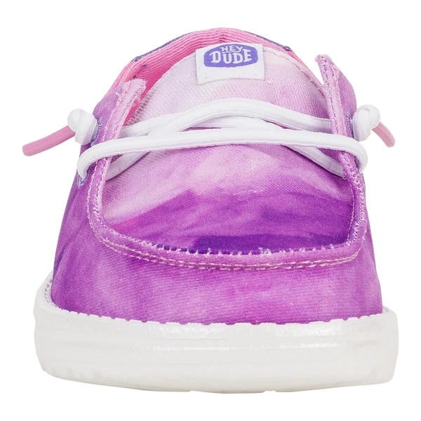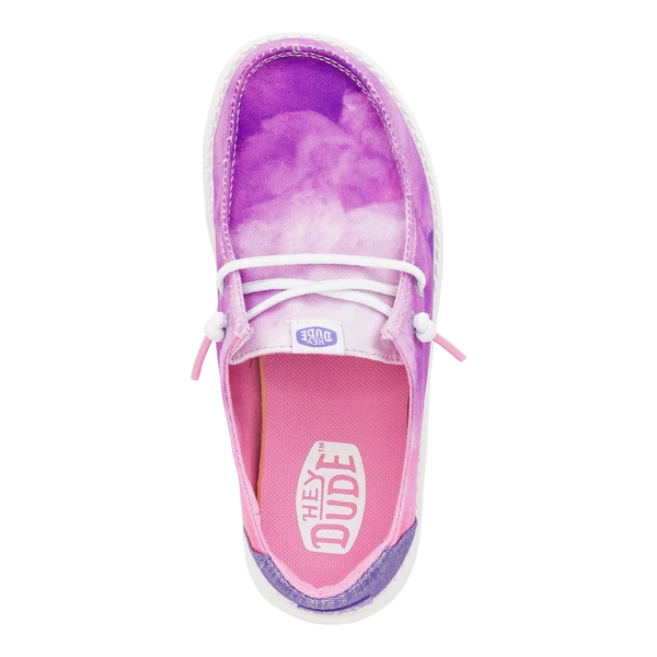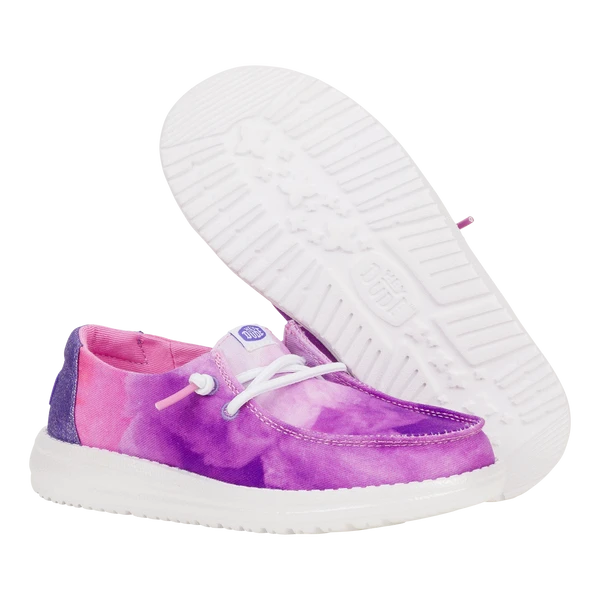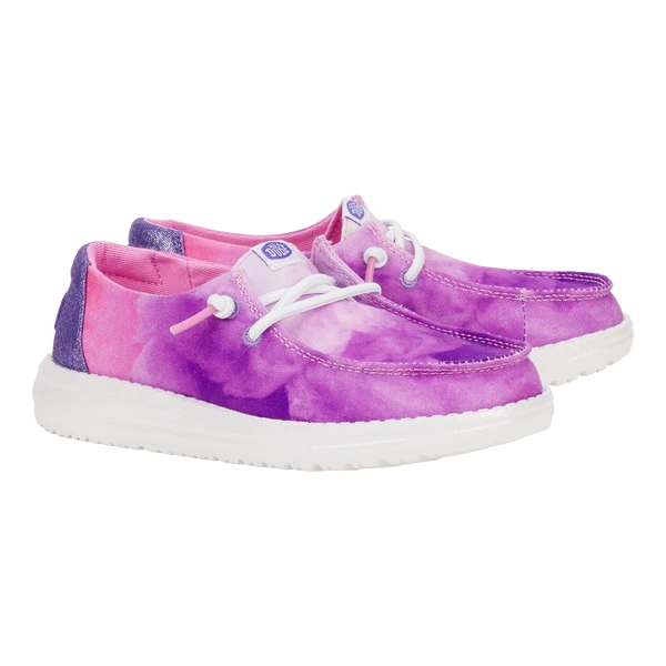 Brighten up her wardrobe with the Hey Dude Girls’ Wendy Cotton Candy Shoes. Featuring a fun tie-dye pattern in pink and purple, these lightweight slip-ons offer playful style with all-day comfort. The easy-on system with elastic laces ensures a secure fit, while the cushioned memory foam insole and flexible outsole make them perfect for every adventure.