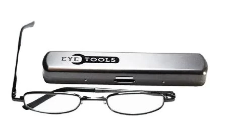 High Quality, Metal Frame Reader with spring hinge rubber temples. Features an aspheric lens. Comes with metal case.
