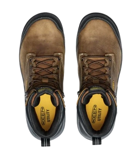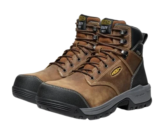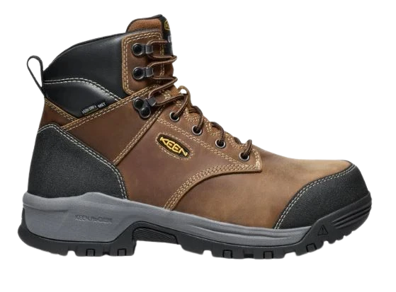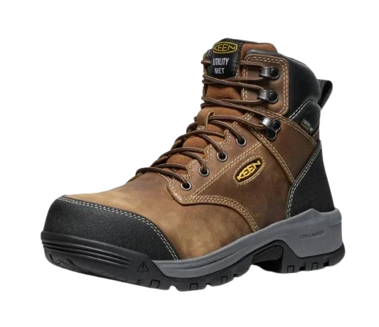 Protects like a work boot, feels like a sneaker. This men’s waterproof 6″ style features a leather upper, energy-returning cushioning, and internal met protection.