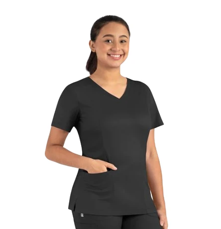 Be edgy at work in Matrix by Maevn Women’s Double V-Neck Solid Scrub Top. The trendy top features a V-neckline with mini V-neck at back for comfort, the short sleeves are breathable, while front and back princess seaming gives a great shape. Completed with Two front patch pockets with small welt pocket and interior instrument loops, the top is a must have.