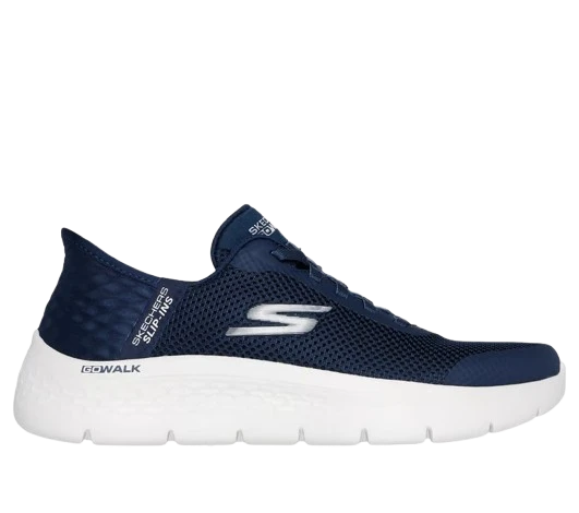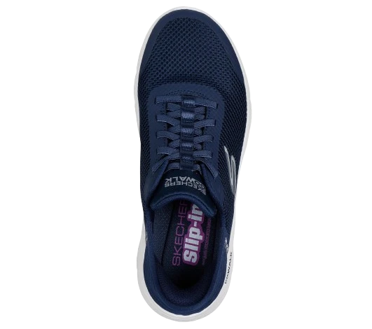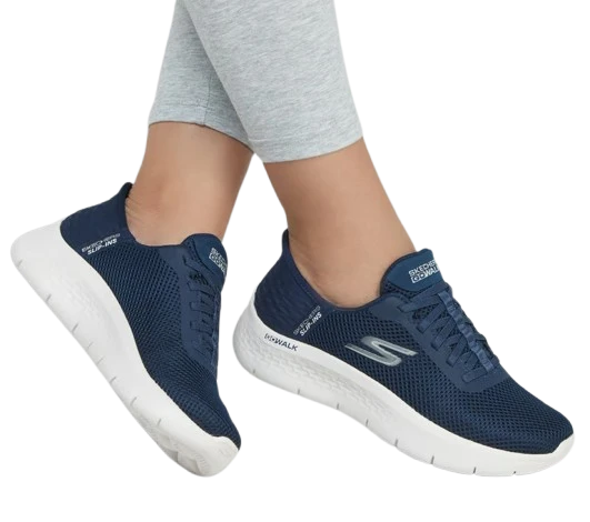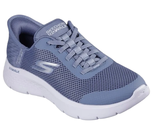 Step-in to convenient walking comfort and cushioning wearing Skechers Hands Free Slip-ins®: GO WALK Flexâ„¢ – Grand Entry. Designed with our Heel Pillow®, this sporty vegan slip-on features a mesh and synthetic upper with stretch laces, a Skechers Air-Cooled Memory Foam® insole, and lightweight ULTRA GO® cushioning.